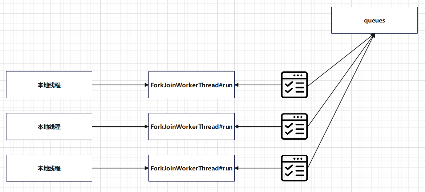 每个线程都会维护一个 ForkJoinPool.WorkQueue,这是一个双端队列。并且这些队列都会被注册到 ForkJoinPool->queues 中