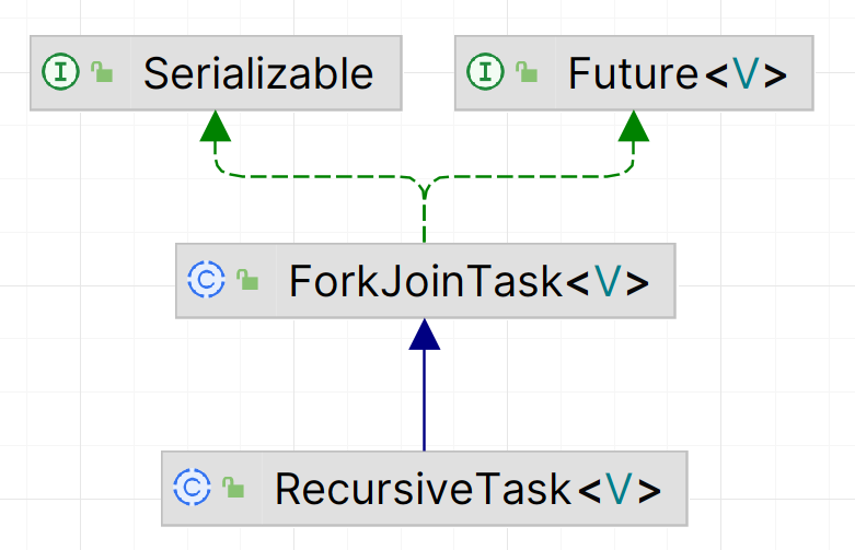 RecursiveTask 是一个抽象类,继承了 java.util.concurrent.ForkJoinTask<V>