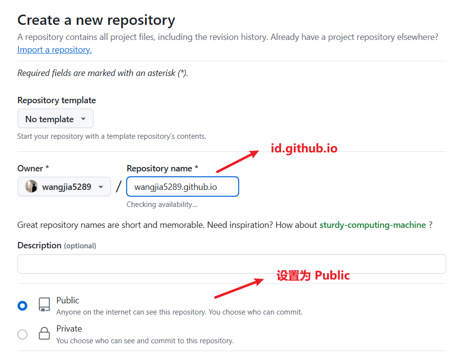 首先,登录 GitHub 并创建一个名为 <your_id>.github.io 的仓库,并确保将其设置为 Public(公开)