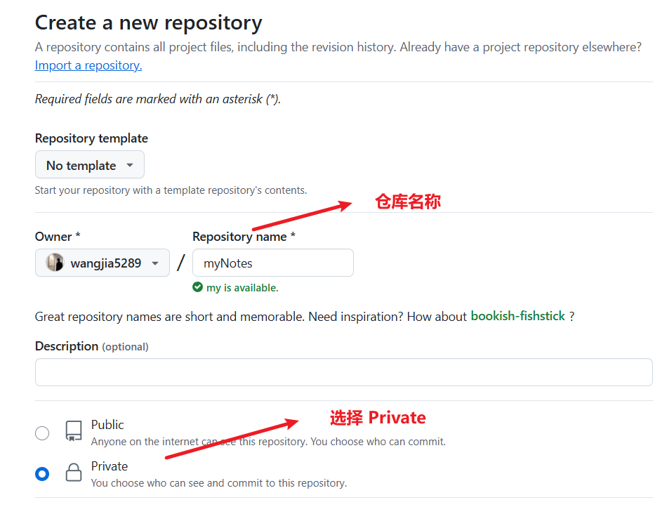 我们额外创建一个名为 myNote(名称可自定义)的仓库,并确保将其设置为 Private(私有)用于备份所有文件,以防数据丢失