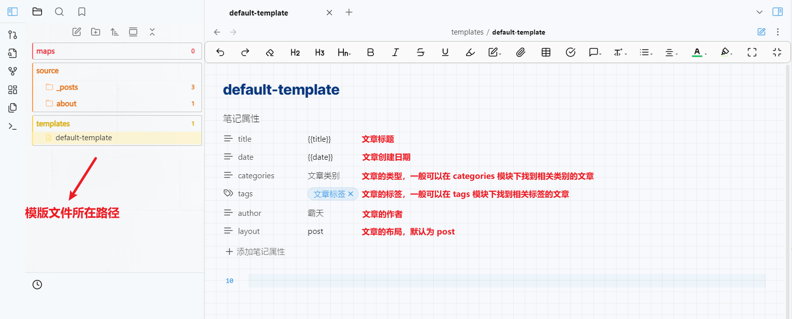 在Hexo中,为确保每篇文章都能以预设格式和样式展示,通常需要在文章头部设置特定的属性。然而,手动设置这些属性对于每一次撰写新文章来说可能显得繁琐。为简化这一过程,可以创建一个模板。这样,每次撰写新文章时,只需导入该模板,即可自动包含所需的默认属性设置。