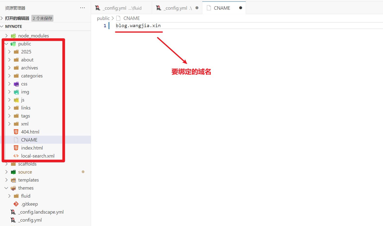 2. 在 public 文件夹下创建一个名为 CNAME 的文件,并在其中保存您希望绑定的域名